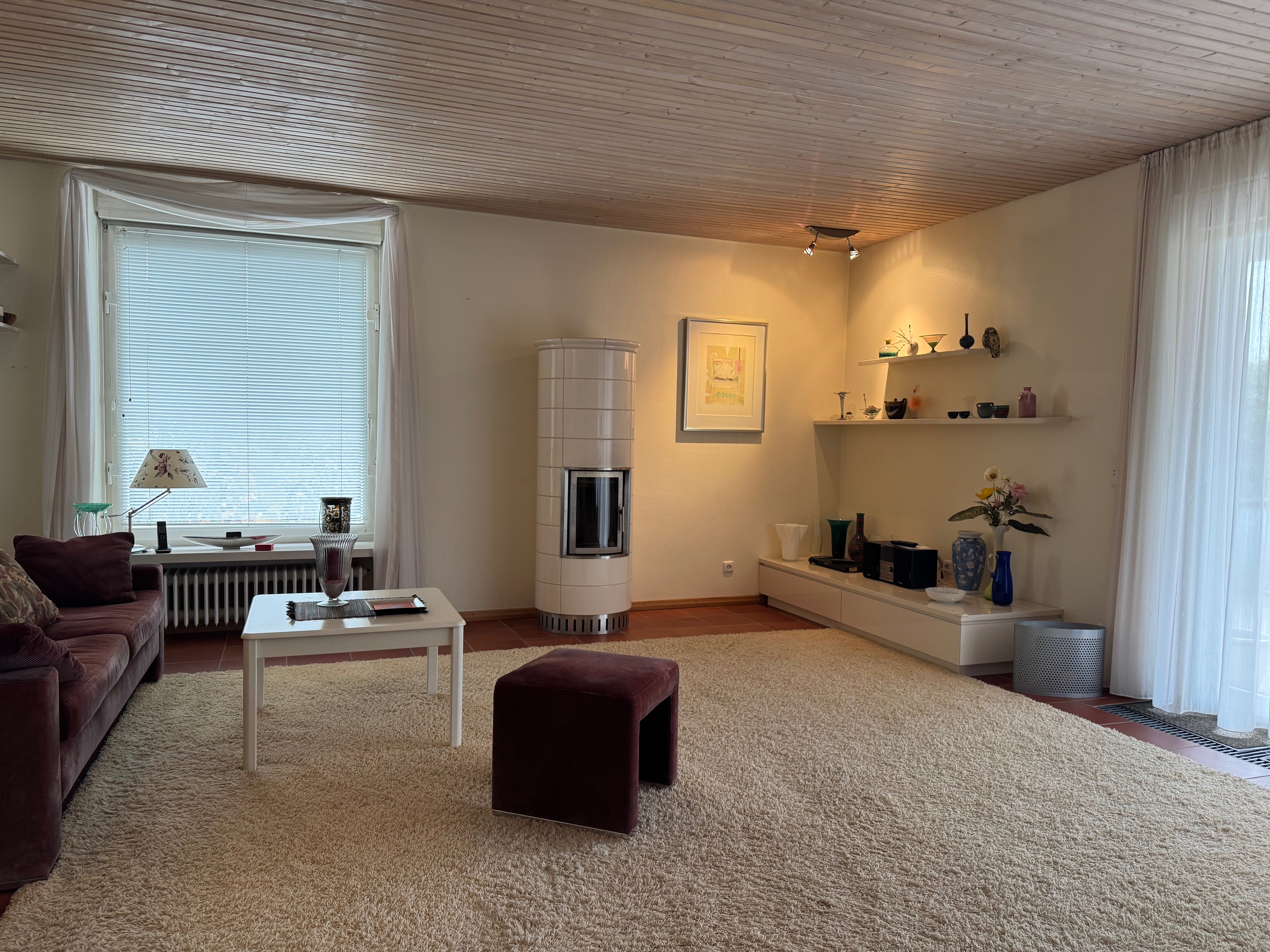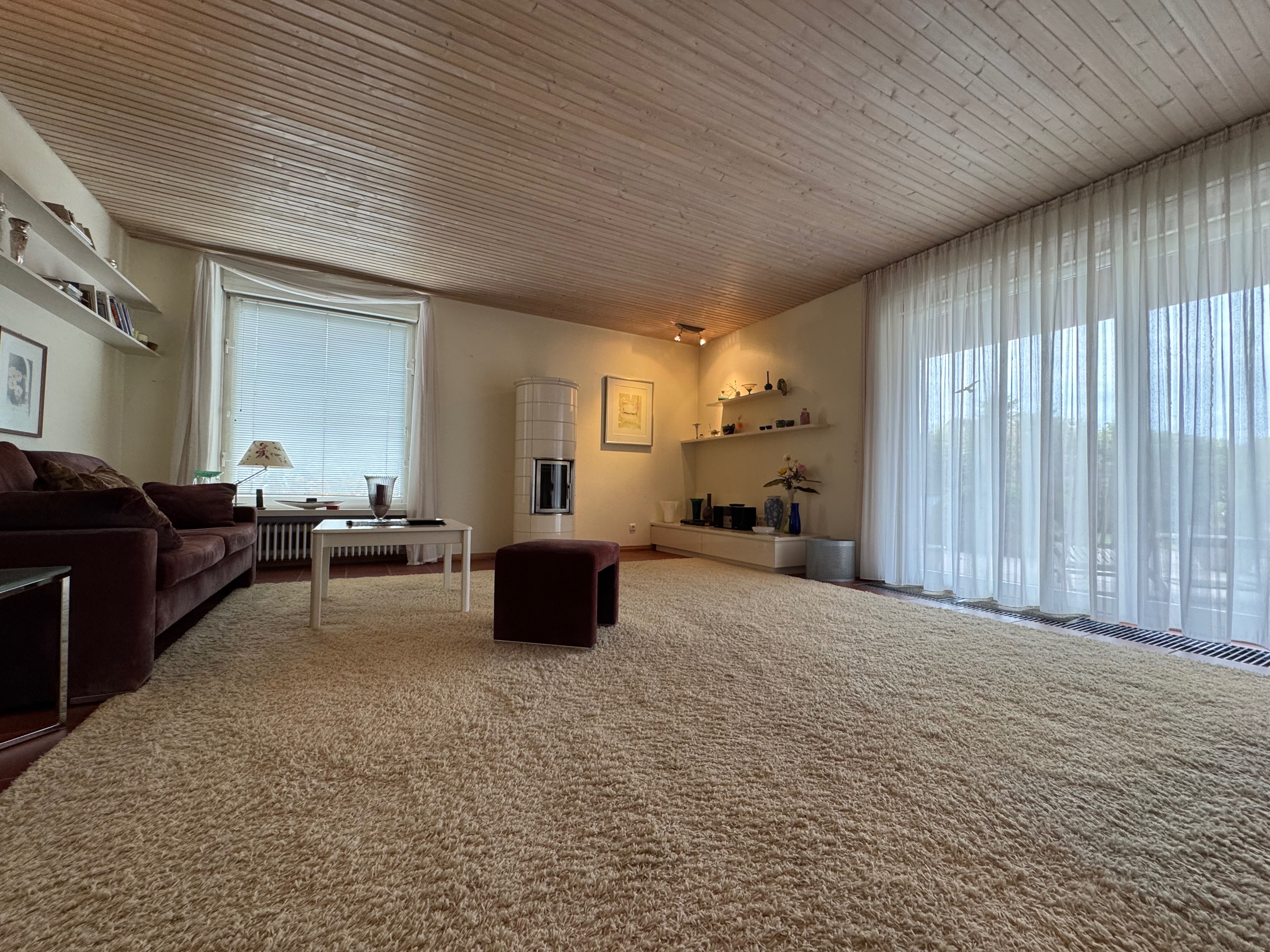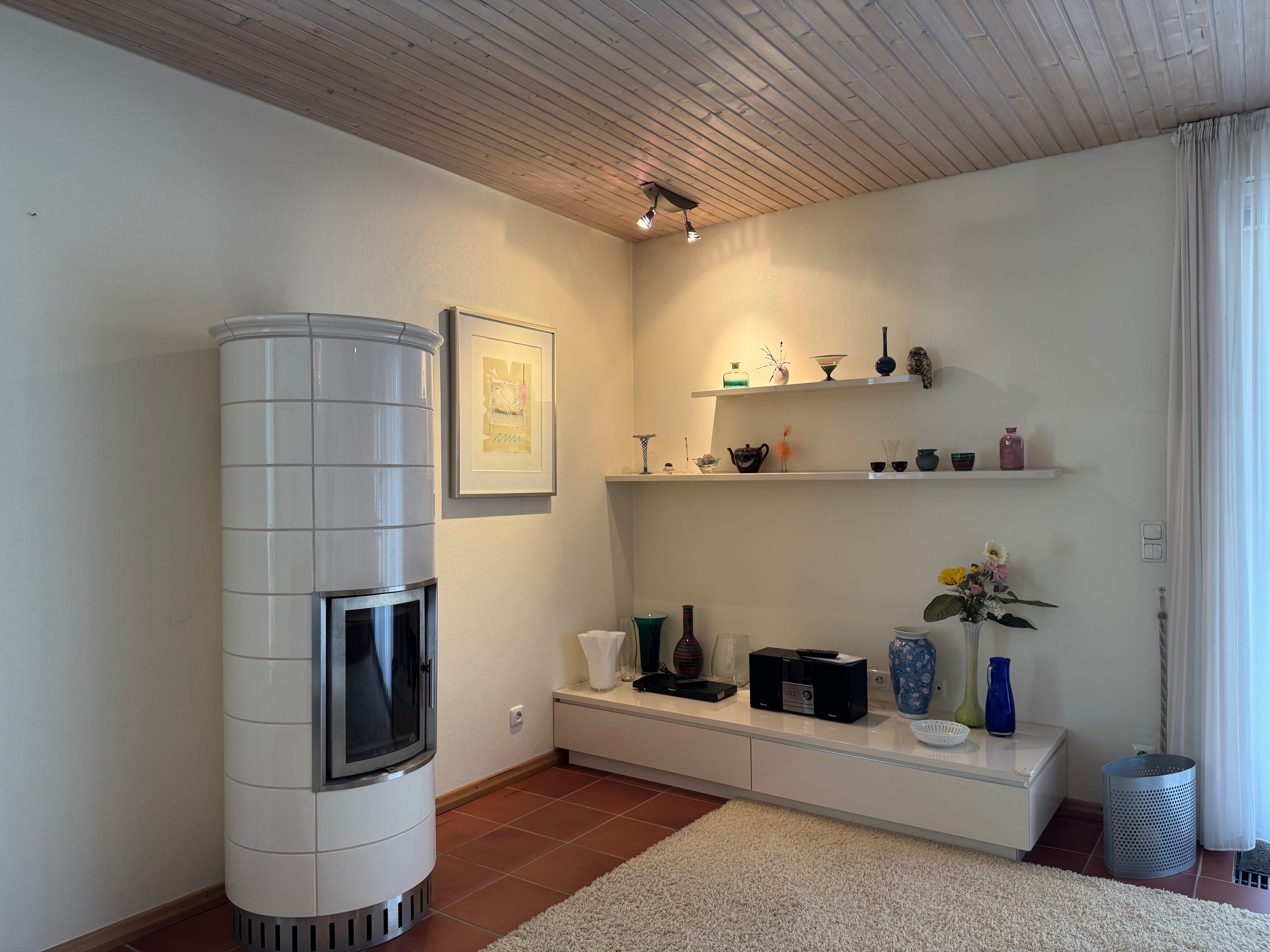 Das großzügige Wohn- und Esszimmer mit zentralem Kamin und Kachelofen bildet das Herzstück des Hauses. Bodentiefe Fenster eröffnen den Blick auf die überdachte Südwest-Terrasse und den gepflegten Garten – ein idealer Ort für gemütliche Stunden und gesellige Abende.