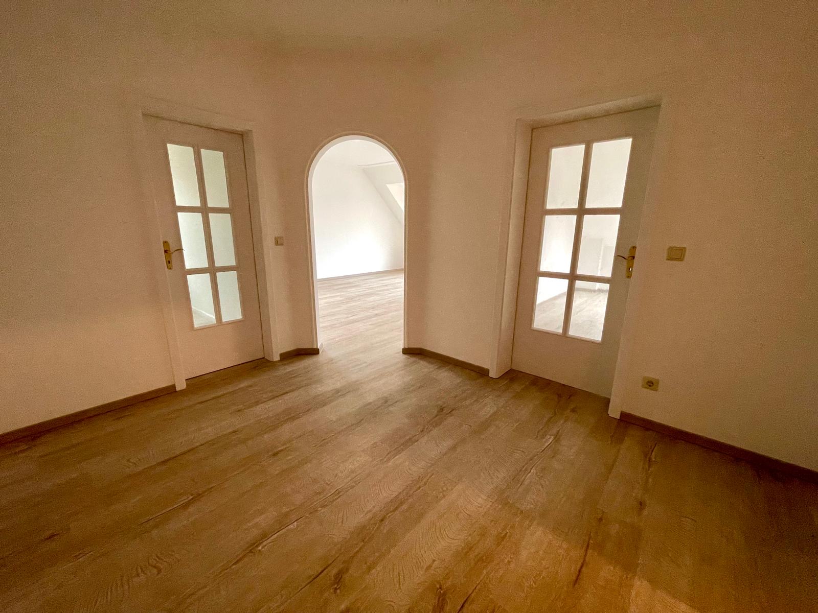 Durch einen eleganten Rundbogen gelangen Sie in das helle Wohnzimmer mit Zugang zum teilweise überdachten Südbalkon.